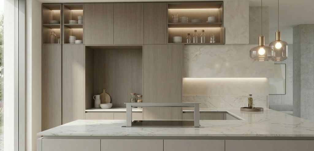 Per questo motivo, nel design delle cucine è fondamentale lavorare non solo sulla funzionalità, ma anche sulla percezione del volume. Un progetto ben equilibrato riesce a mantenere la capacità contenitiva e l’efficienza operativa senza creare masse troppo compatte o visivamente pesanti. Uno degli strumenti più efficaci per raggiungere questo equilibrio è la combinazione tra elementi pieni e vuoti. Alternare superfici compatte con nicchie aperte, materiali più chiari o elementi più leggeri permette di interrompere la continuità dei volumi e di dare maggiore profondità alla composizione.